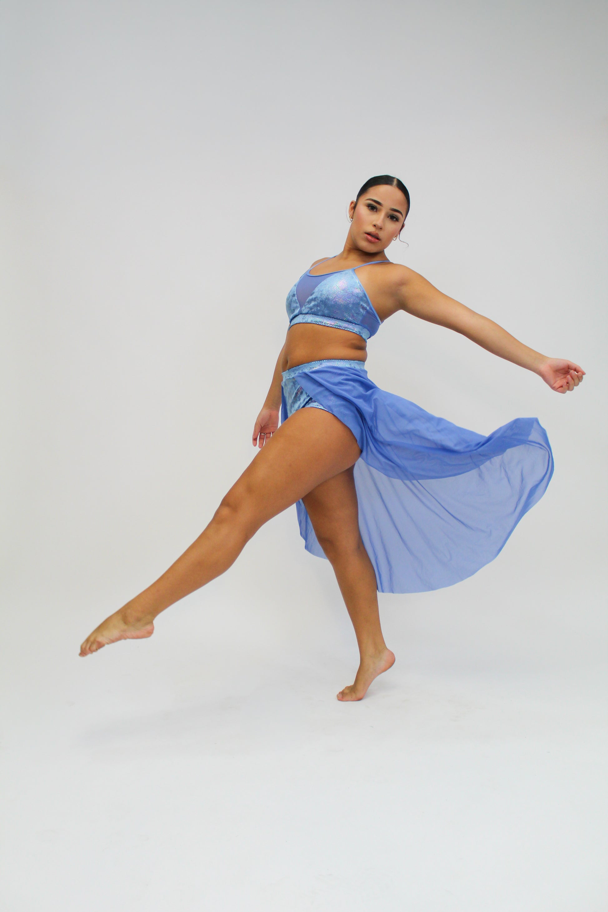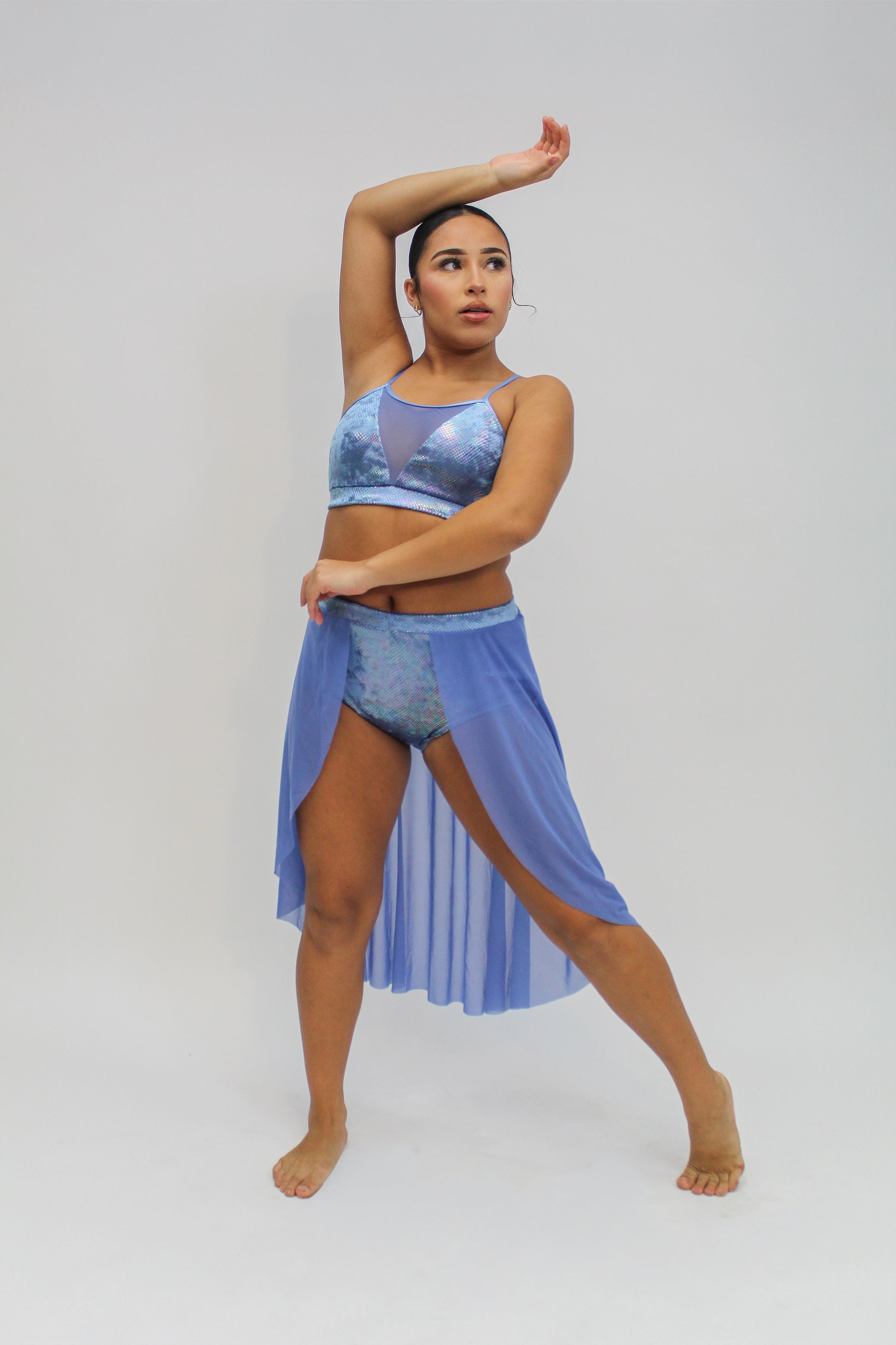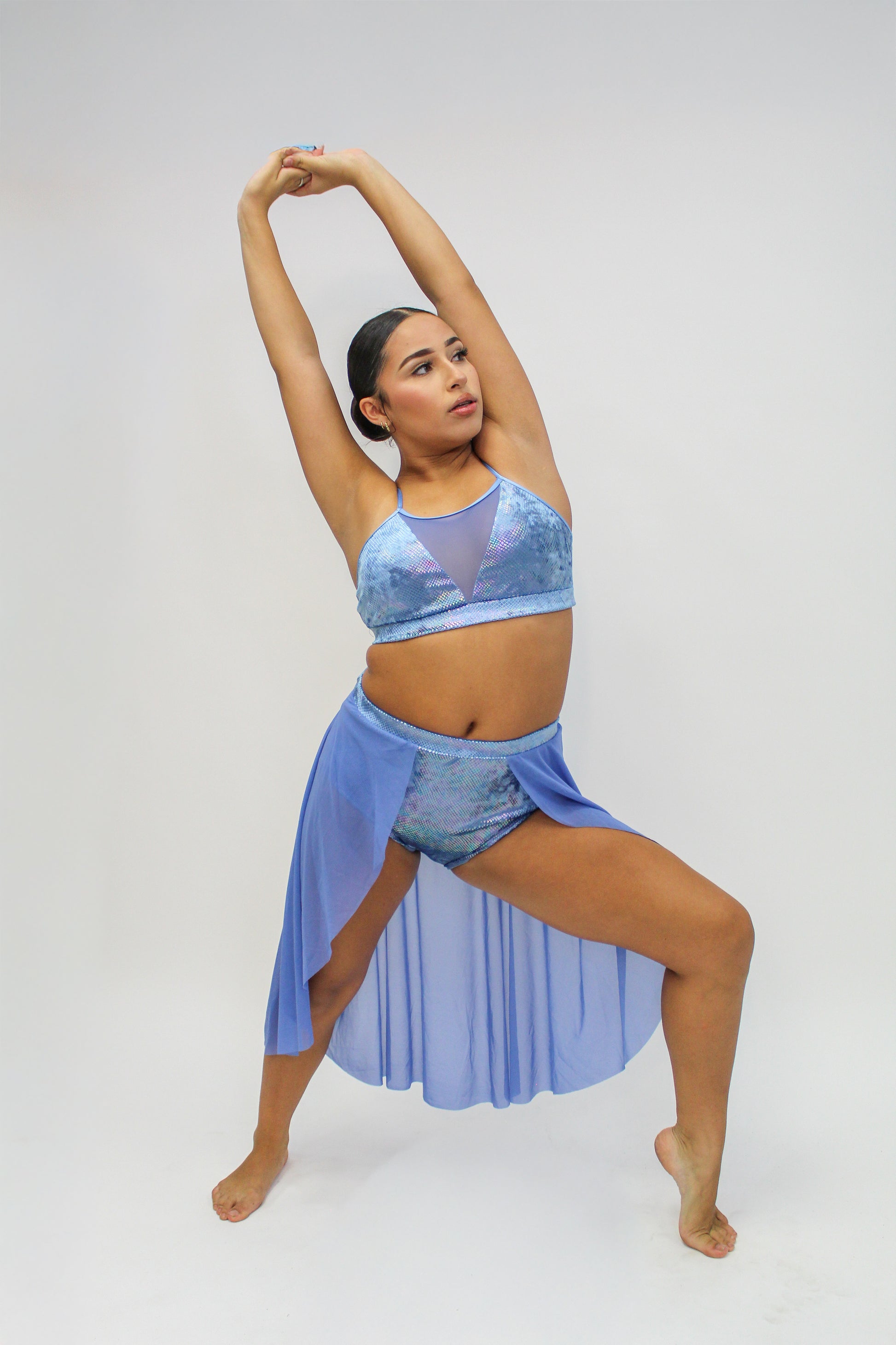 Only sold as a set. Ships unembellished. Detached sleeves and attached skirts/pants are optional add-ons to the brief. Model is wearing Back Skirt add-on.
